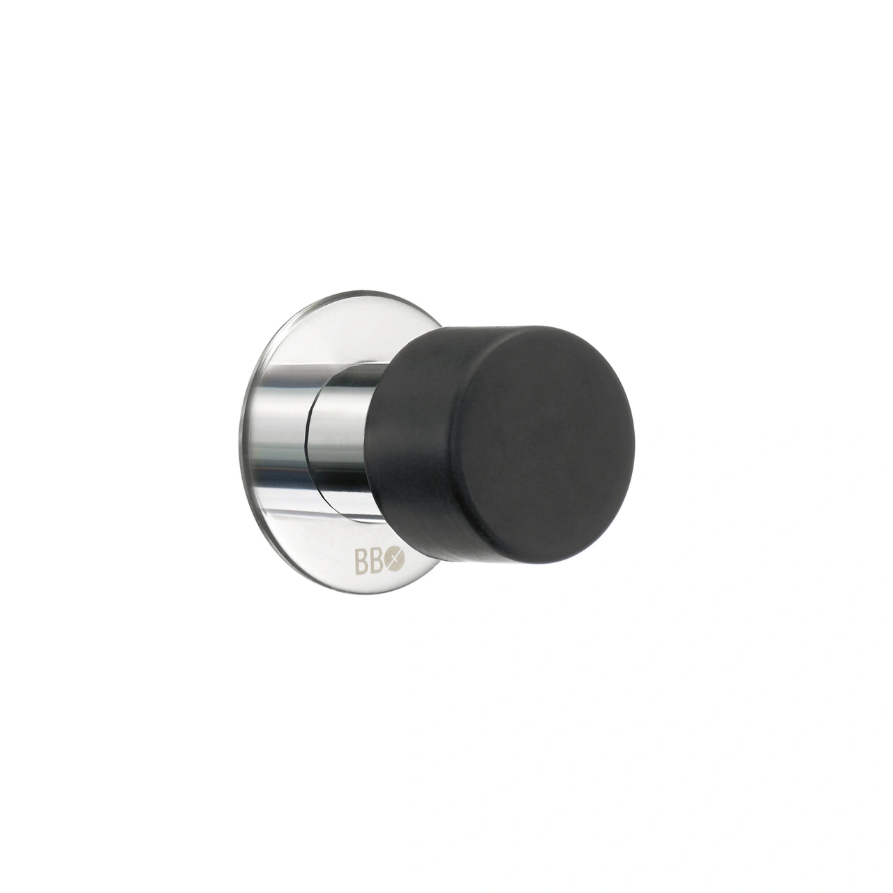 Practical and stylish polished chrome self-adhesive door stop from Beslagsboden for wall mounting. The door stop is made from stainless steel with a polished surface and black rubber that protects both door and wall from unsightly marks.