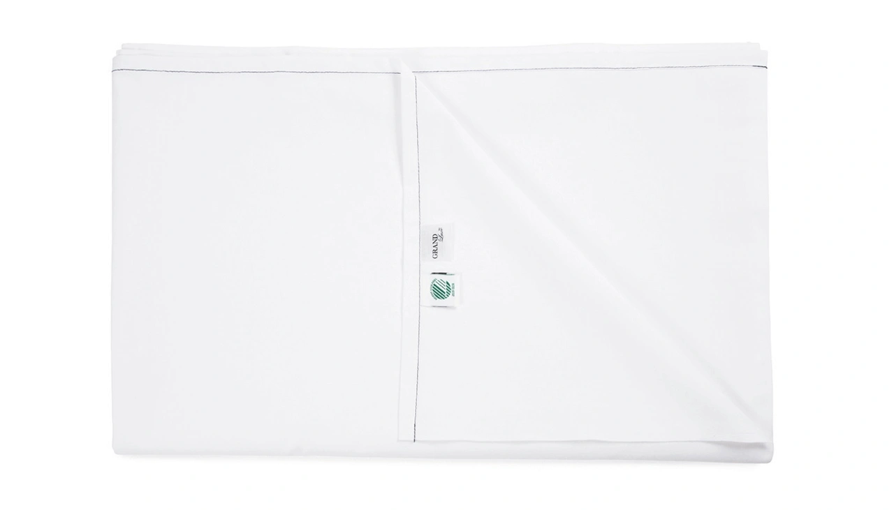 Hotel flat sheets, double sheets. 50% cotton 50% polyester. Easy handling after washing and drying. Thread count: T180. Wide undersheets. Color coded with a blue stripe for easy identification. OKEO-TEX.
