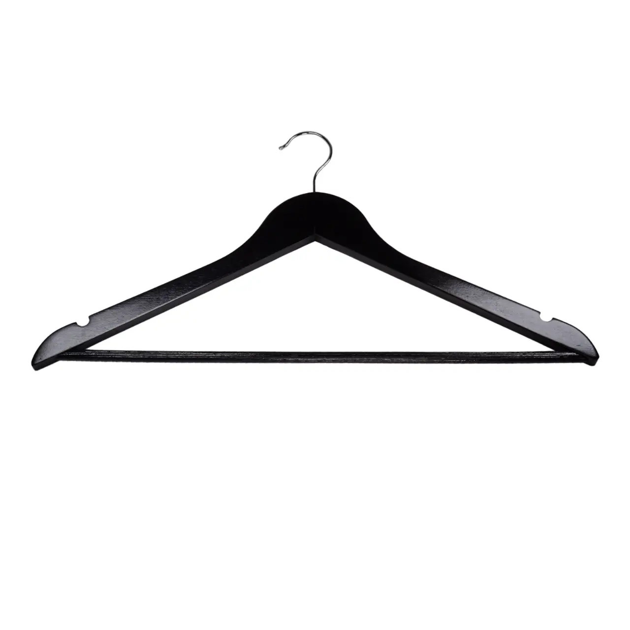 Trägalge i svart trä. Rak med tvärslå, skåror på galgens båda sidor som förhindrar att kläder med hängband glider av.