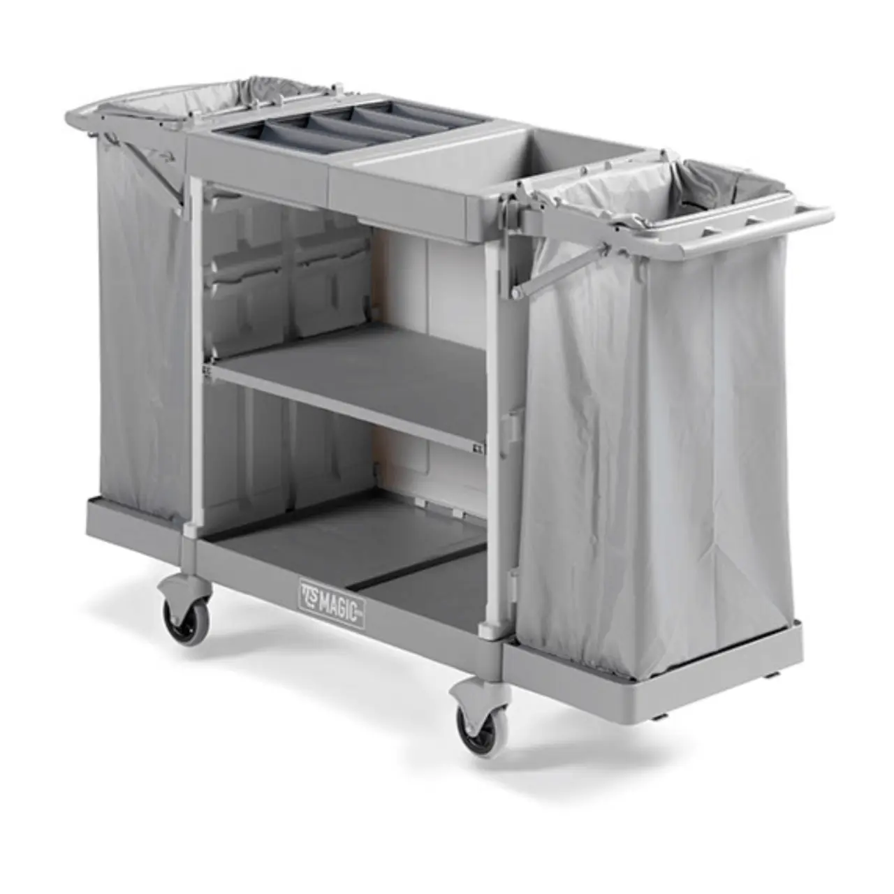 Denna städvagn har en toppbricka till gästartiklar, avdelare samt 2 fasta och 2 svängbara hjul. Två säckar för tvätt eller avfall ingår. Avtagbara baser för utrymmesoptimering. Beställningsvara. Miljövänlig: Helt tillverkad av polypropen, rostar inte, är solid och helt återvinningsbar. Komponenter tillverkade av återvunnen plast